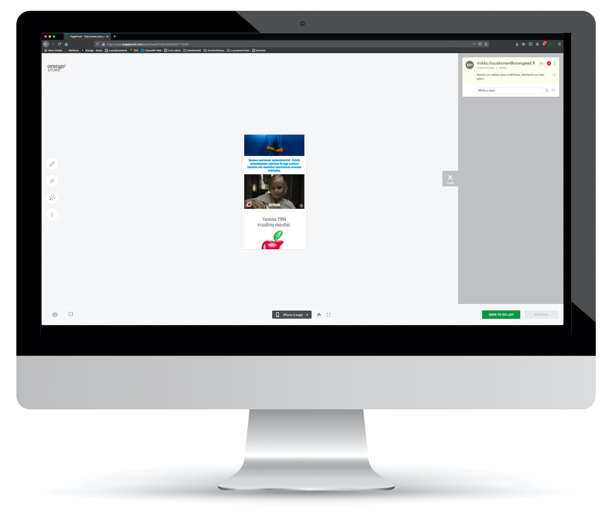 Orange Storessa voi kommentoida ja hyväksyä visuaalisesti kaikki materiaalit ja aineistoformaatit (audio, video, verkkosivut, pdf-dokumentit, kuvat, HTML-tuki tulossa myös).